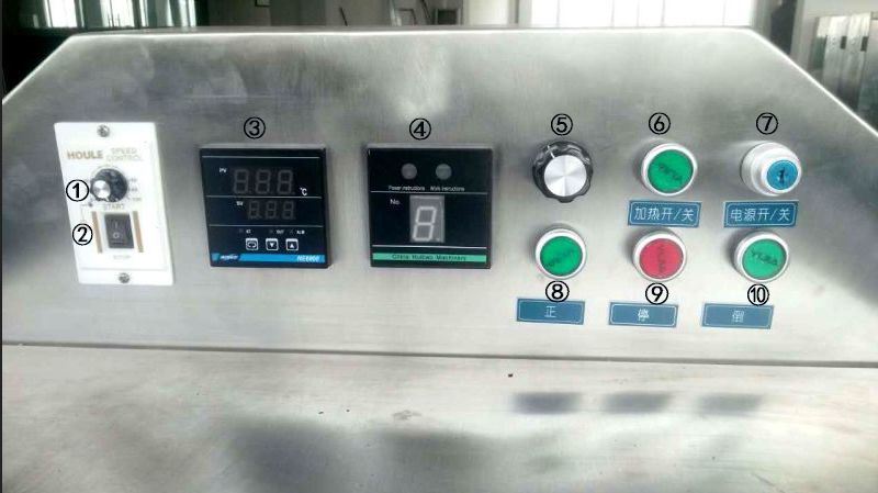 ⑥、“加熱開/關(guān)”(正面綠色):炒貨機(jī)加熱開關(guān)按鈕,按一下燈亮?xí)r開始加熱,再按一下燈滅時(shí)停止加熱。炒貨前一般需要先預(yù)加熱。